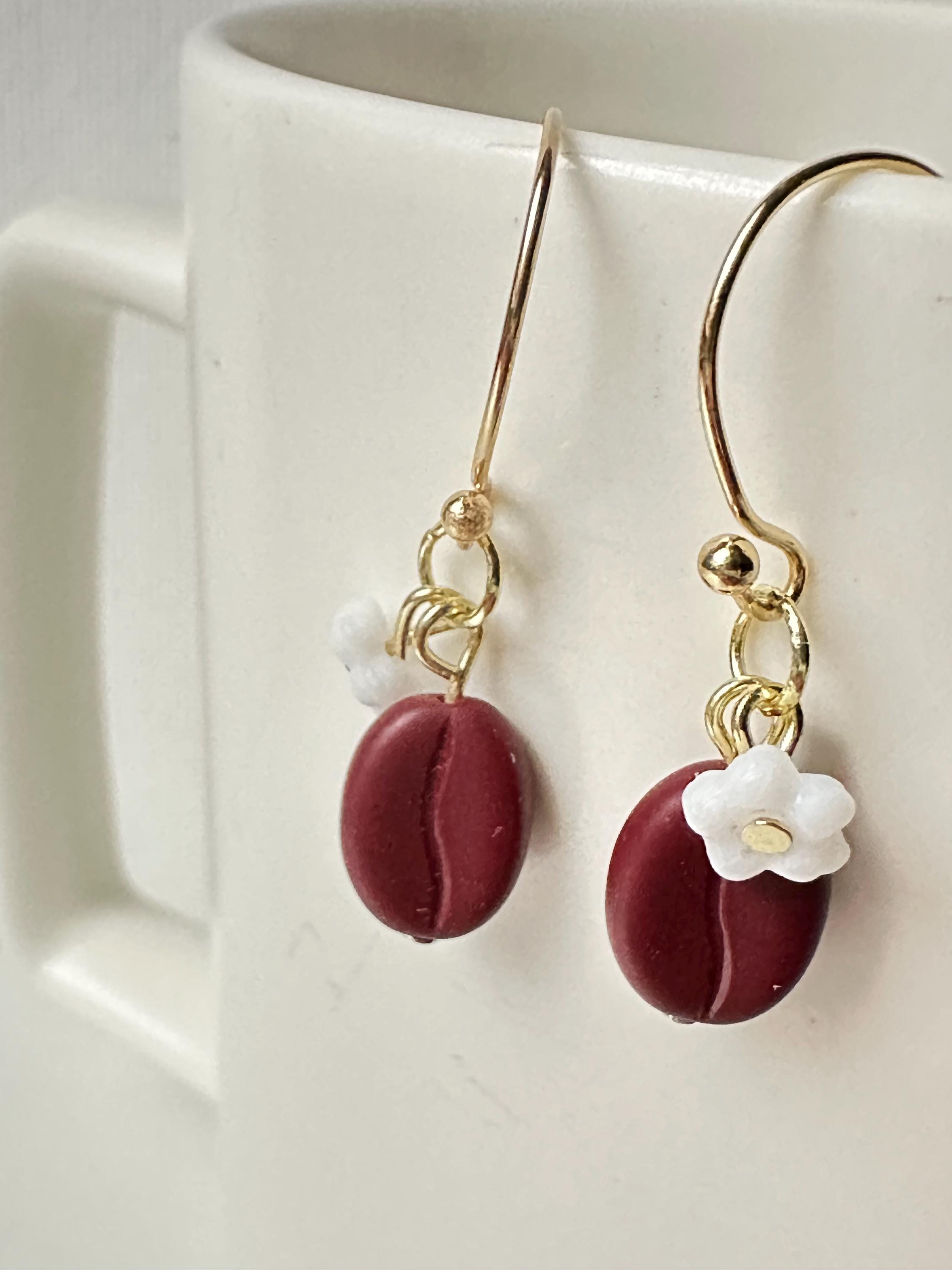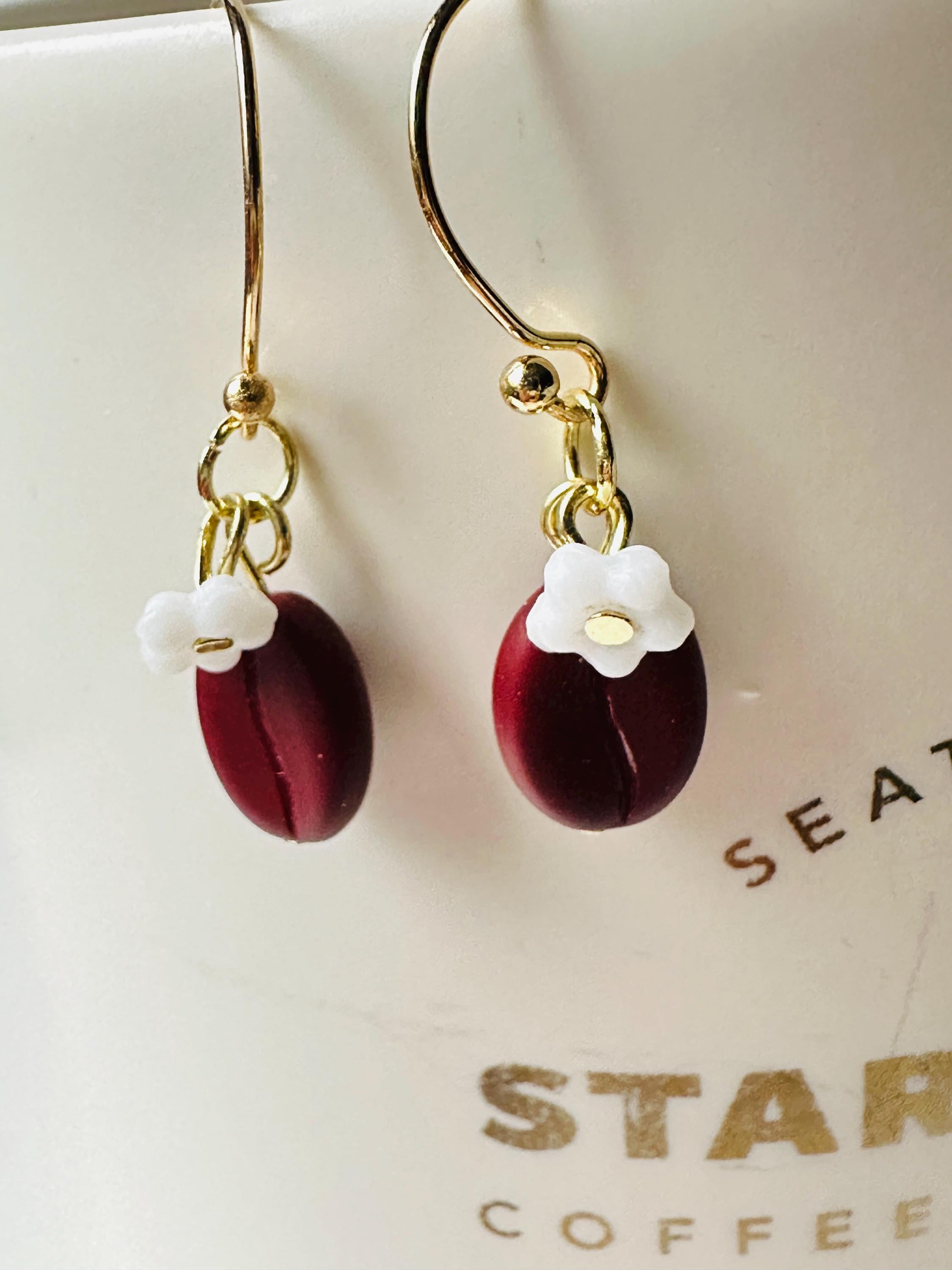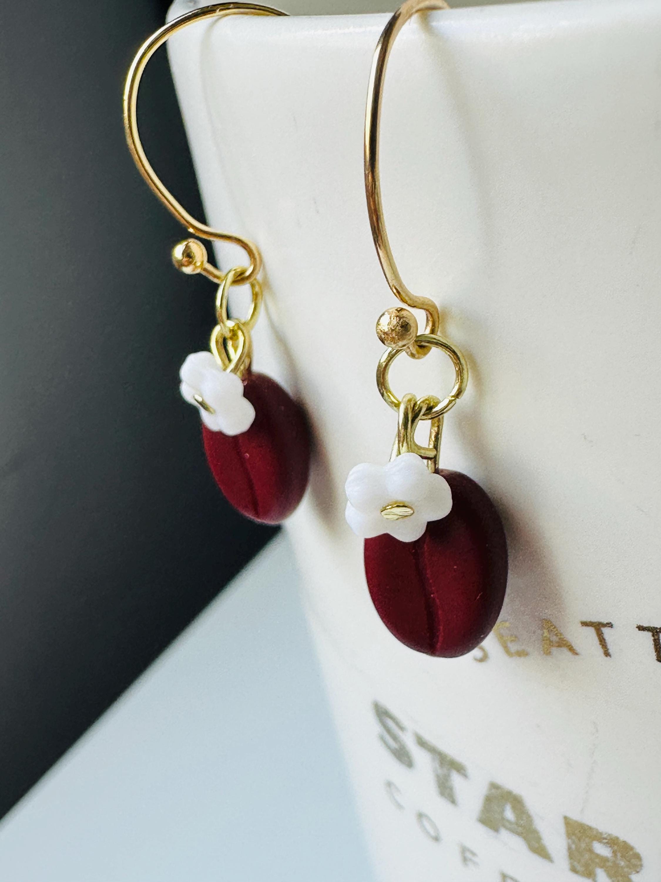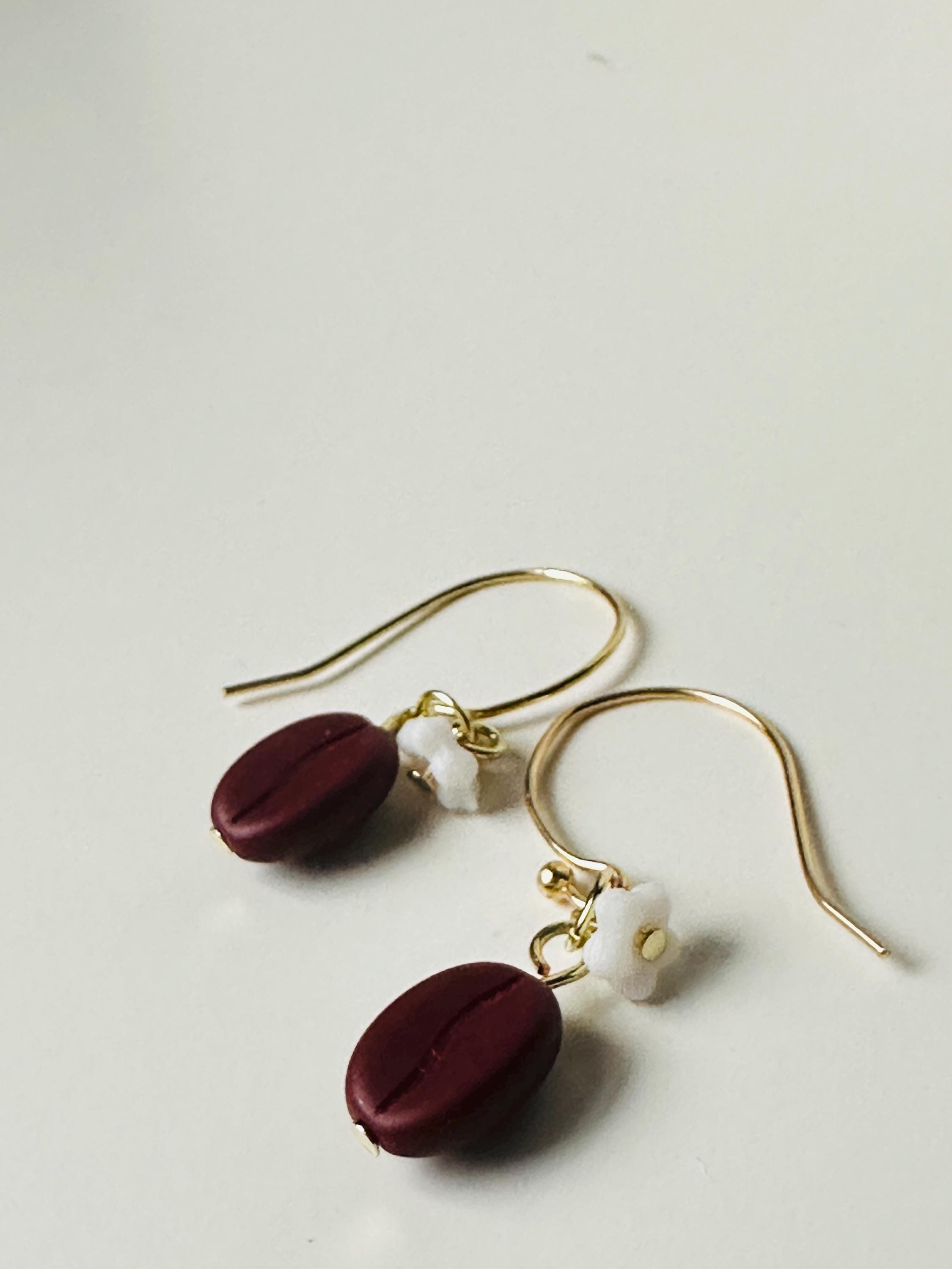 Coffee bean with white flower earrings handmade from Czech glass beads