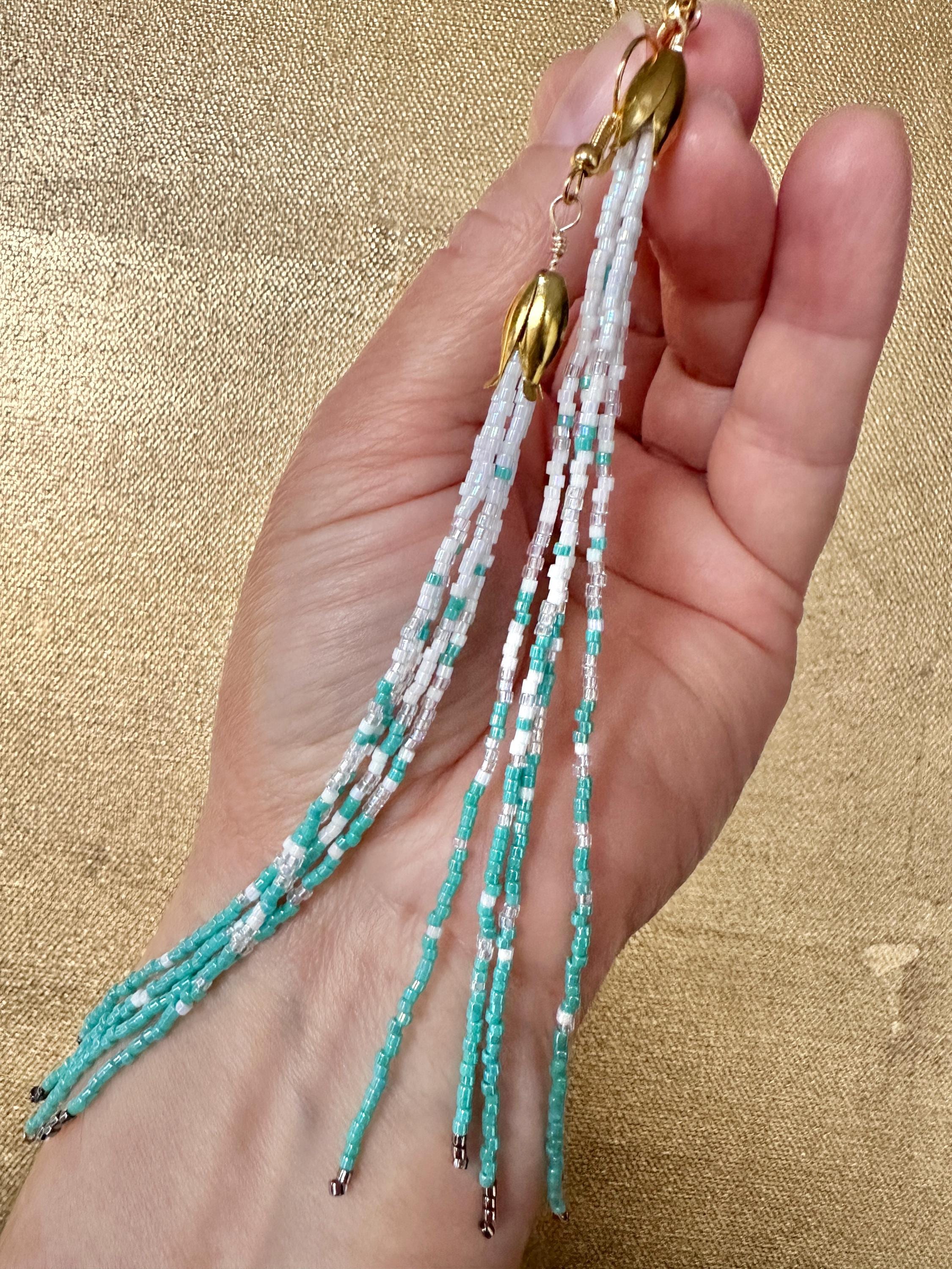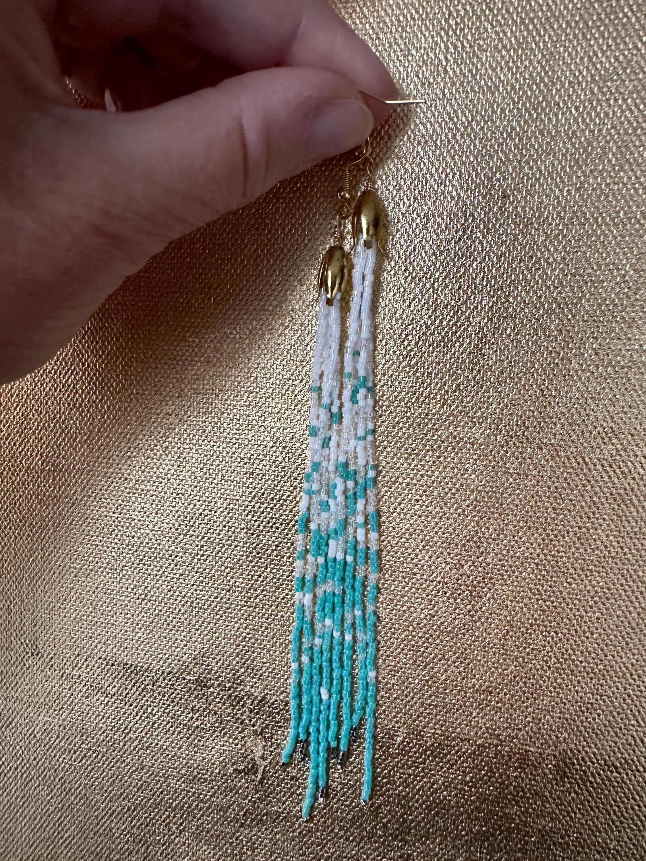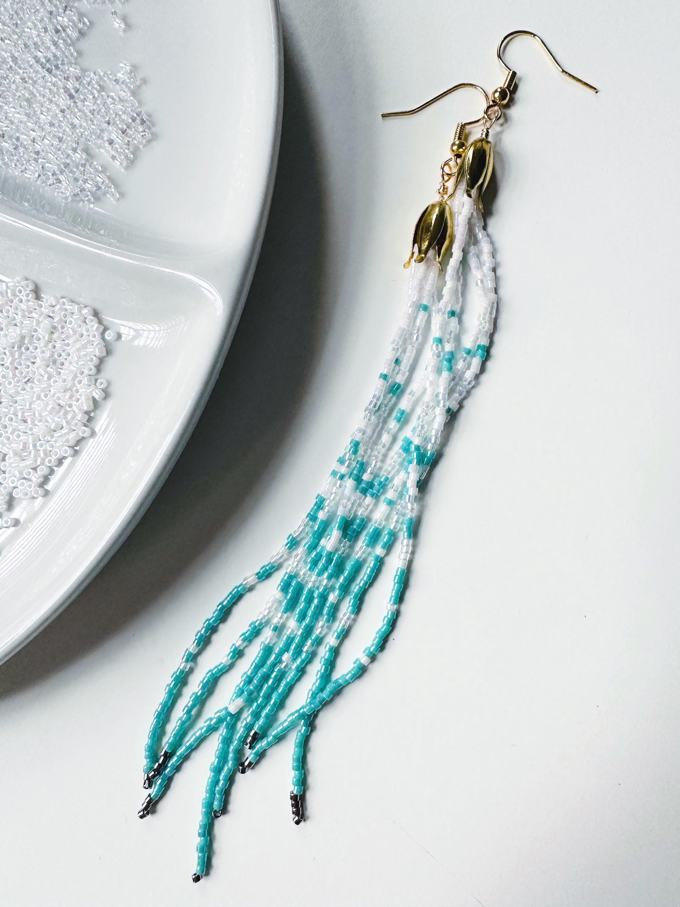 Handmade Sea foam color earrings from Japanese glass beads in teal blue, white, metal and iridescent. One of a kind jewelry.