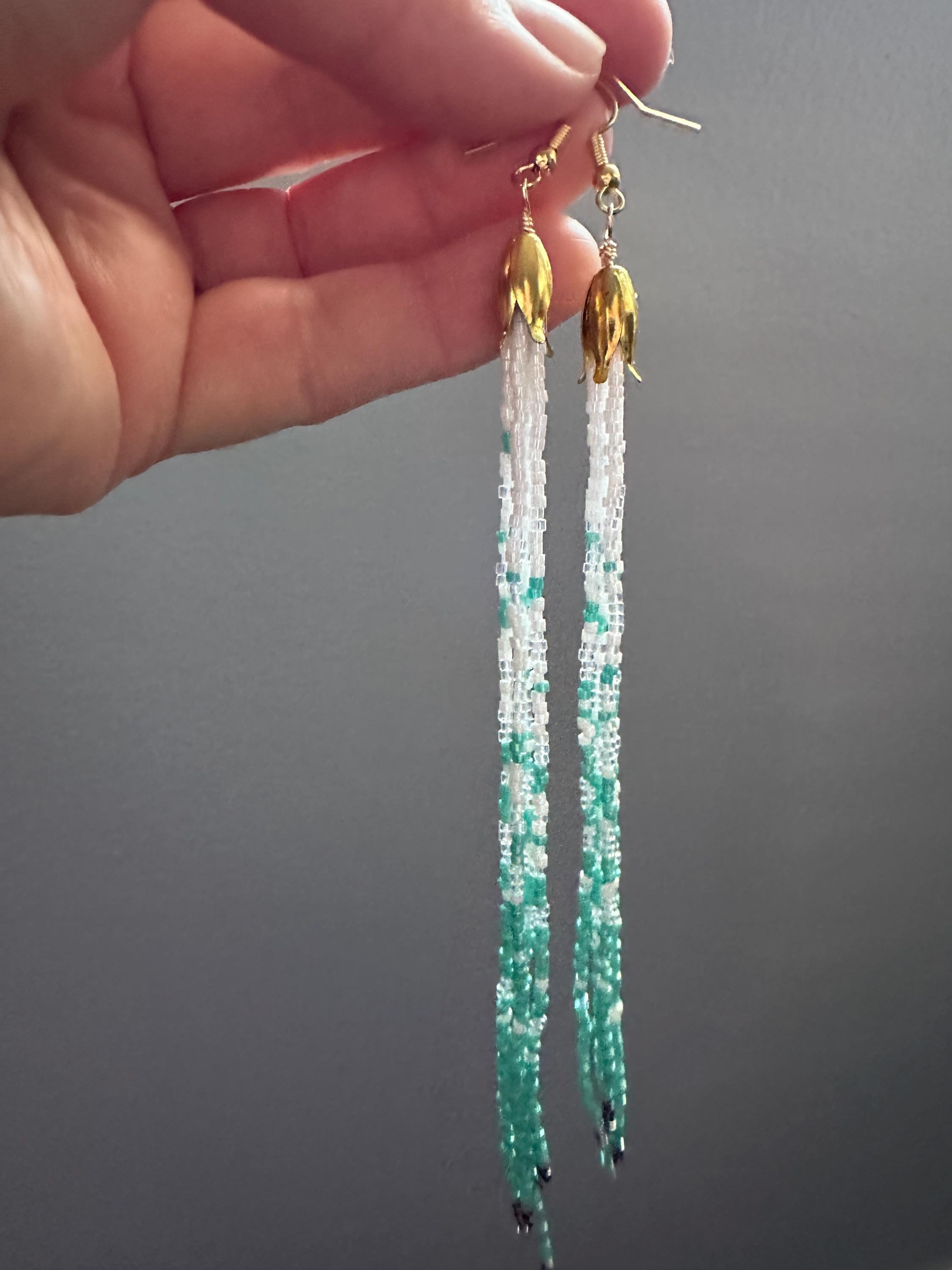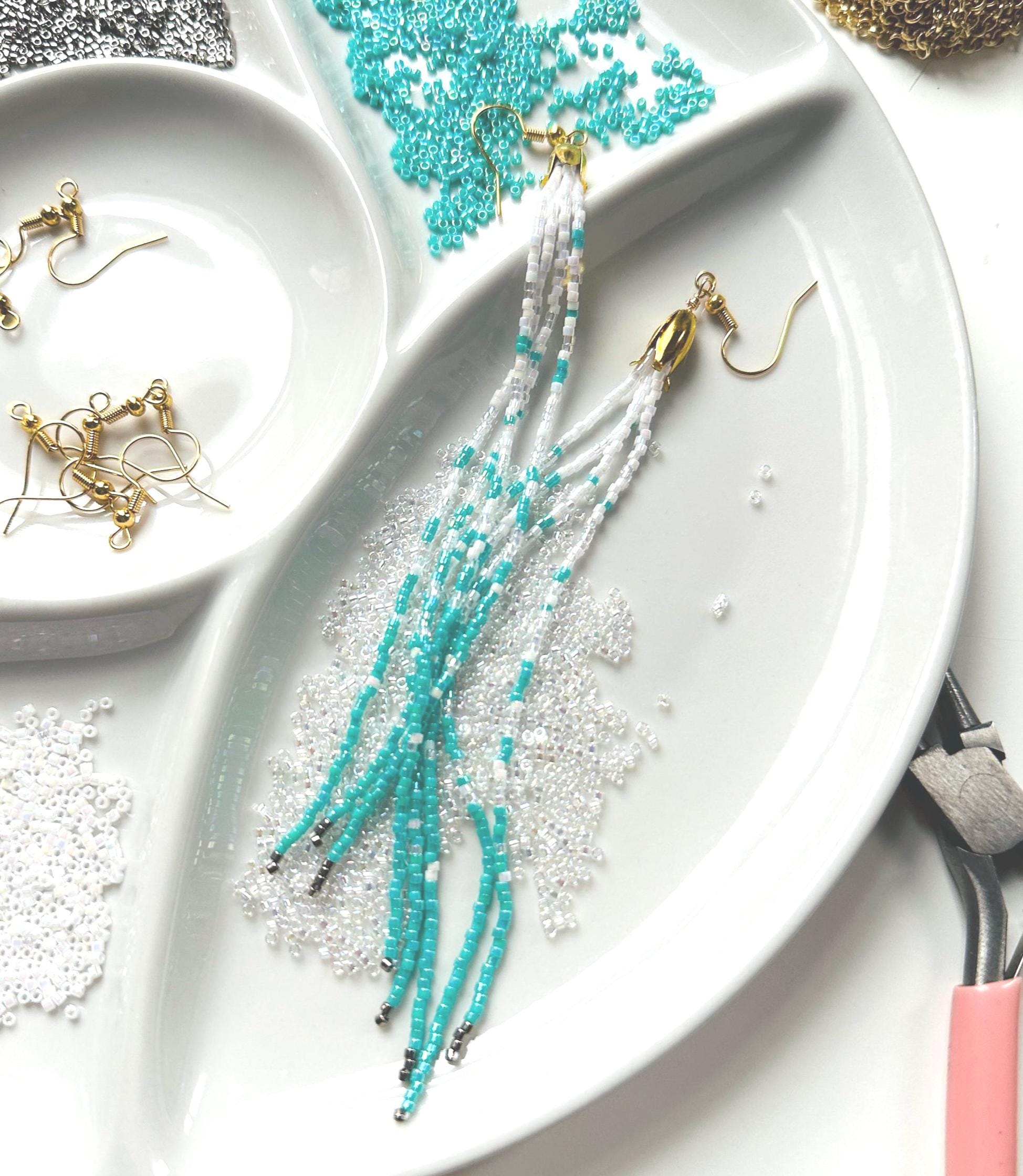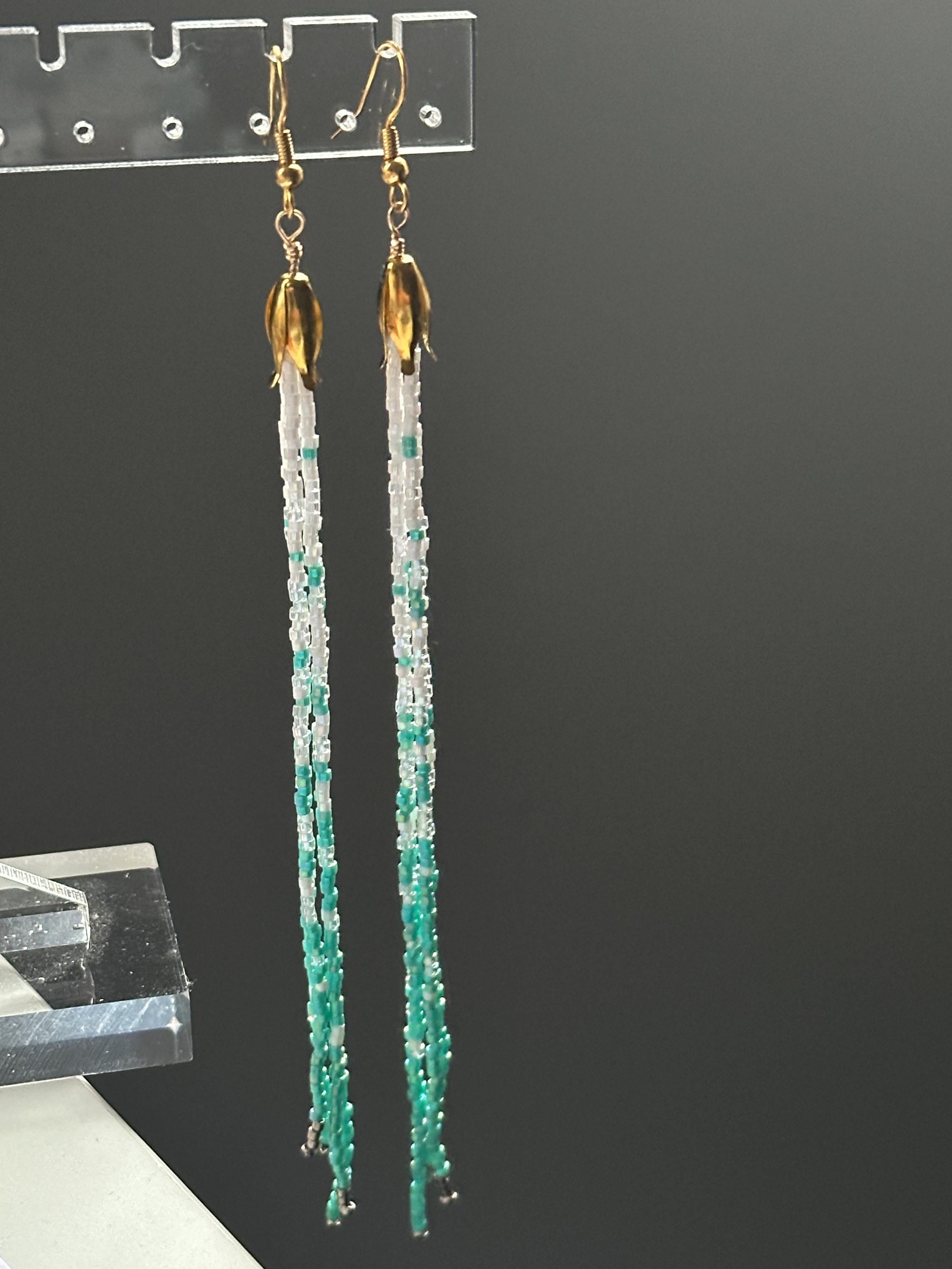 Handmade Sea foam color earrings from Japanese glass beads in teal blue, white, metal and iridescent. One of a kind jewelry.